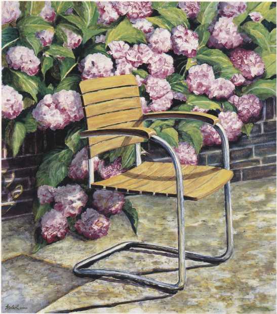 Loomchair neben weißen Hortensien, 1994, Öl auf Lwd., 80 x 70 cm