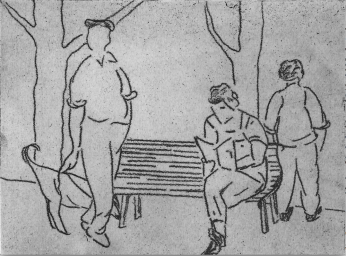 Drei Männer um eine Parkbank, 1991, vernis mou/Weichgrundätzung,15 x 20 cm