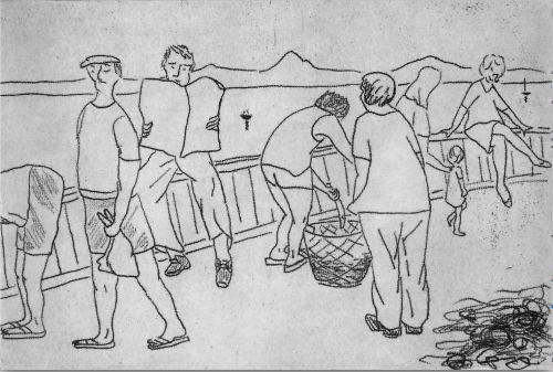 Fischer auf der Mole, 1993, vernis mou/Weichgrundätzung, 20 x 30 cm