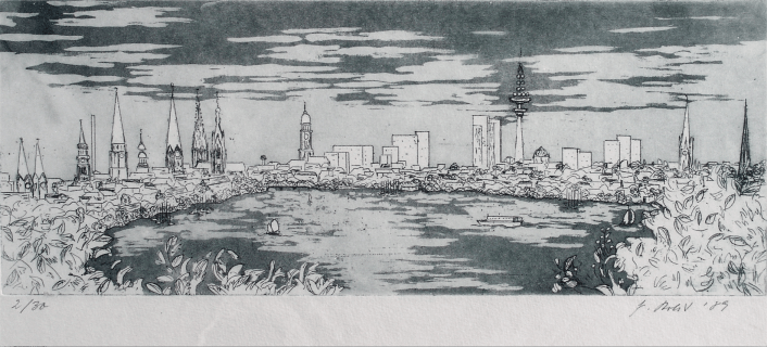 Hamburg-Ansicht, 1989, Aquatinta-Ätzradierung, einfarbig, 32 x 12,5 cm