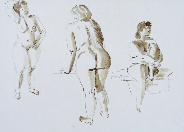 Weibliche Akte: drei sitzende Frauen, 1994, Tinte, laviert, 36 x 47 cm